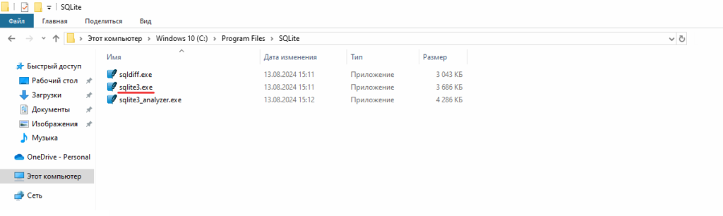 - Перейдите в папку SQLite и запустите программу sqlite3.exe:
