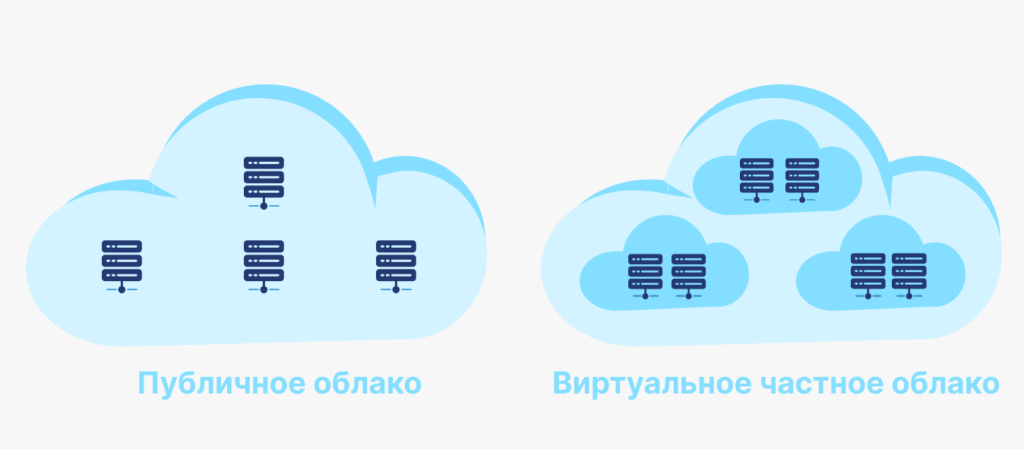 Его еще называют VPC (virtual private cloud). Это изолированная среда в инфраструктуре публичного облака. По сути, это облако в облаке — пользователи не делят с соседями используемое оборудование, как в публичной инфраструктуре, а пользуются выделенными изолированными ресурсами нескольких серверов, объединенными с помощью технологии виртуализации. Виртуализация гарантирует, что организации в таком облаке полностью изолированы и не влияют друг на друга.