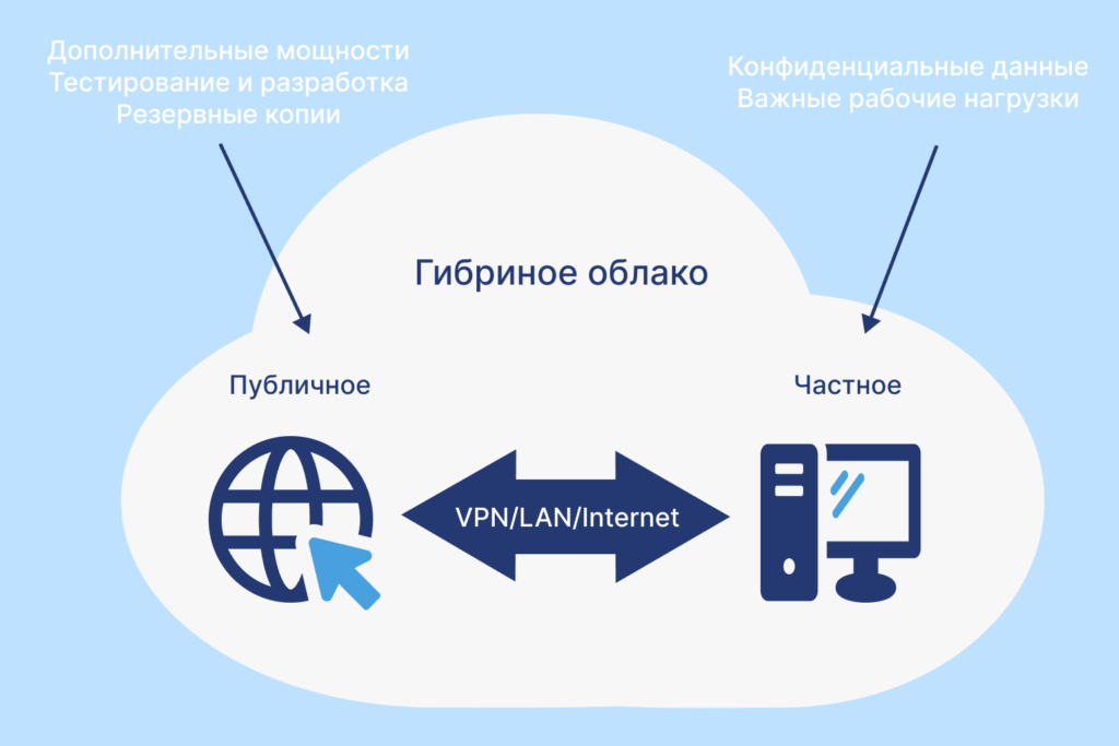 Гибридное облако — это ИТ-инфраструктура, в которой часть ресурсов используется как частное облако, а другая часть — как публичное: