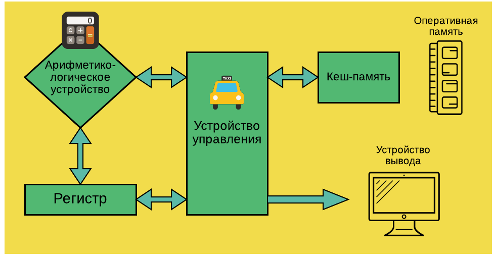 - Устройство управления (УУ). Управляет работой CPU с помощью электрических сигналов. От него зависит согласованность работы всех частей процессора и его связь с внешними устройствами.