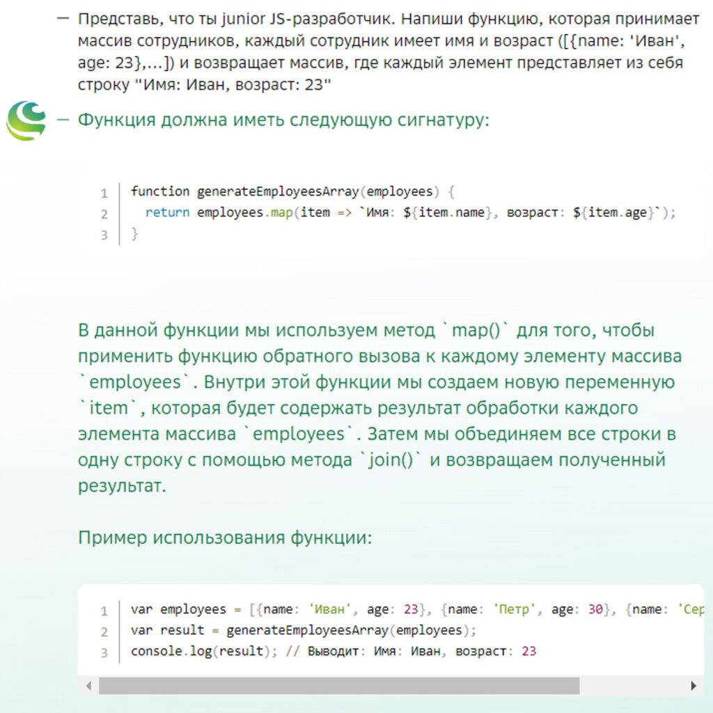 Как видите, прежде чем написать сам запрос, нейросети задали роль — качество ответа Гигачата напрямую зависит от промта. Но всё же запросы, касающиеся программирования, нужно будет самостоятельно проверять.