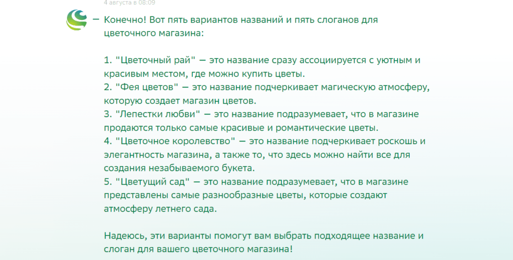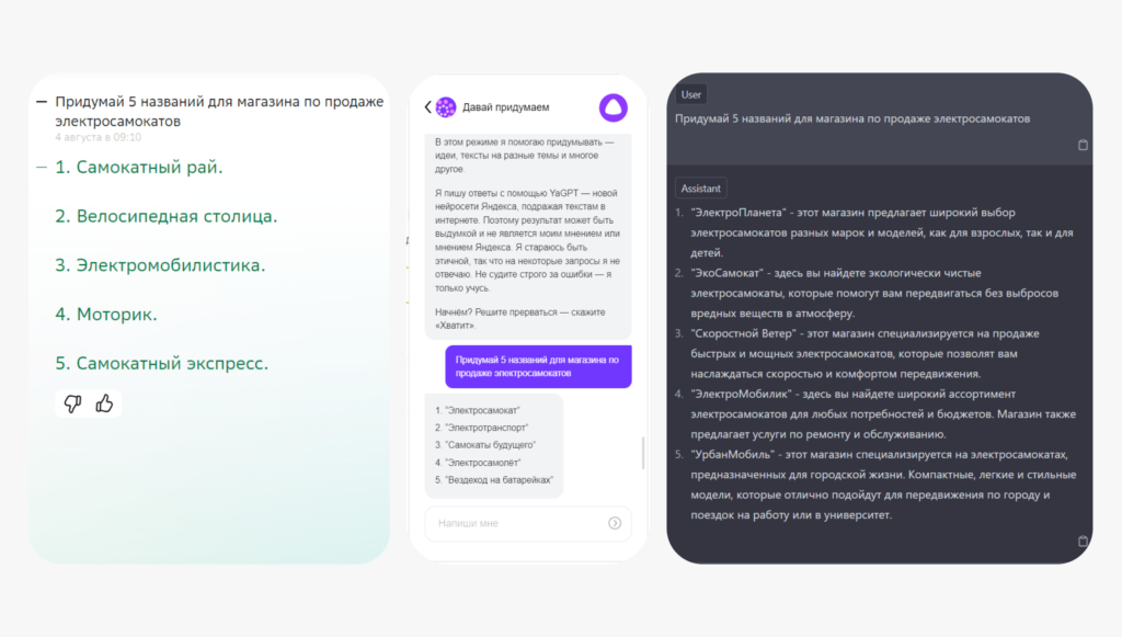 ChatGPT от компании OpenAI (мы использовали бесплатную версию на основе GPT 3,5) оказался лучшим в этой тройке — он не просто предложил готовые варианты, а еще и объяснил свой ответ. Кроме того, он предложил варианты названий для магазина, ориентированные на разную целевую аудиторию — здесь и экологичные самокаты, и самокаты для города. GigaChat и YaGPT, конечно, справились, и предложили достойные идеи, но без каких-либо дополнительных пояснений.