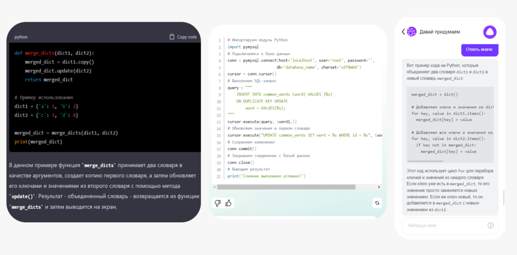 Вот другой пример — мы решили попробовать GigaChat, YaGPT и ChatGPT в качестве разработчиков и дали задание написать код на Python.