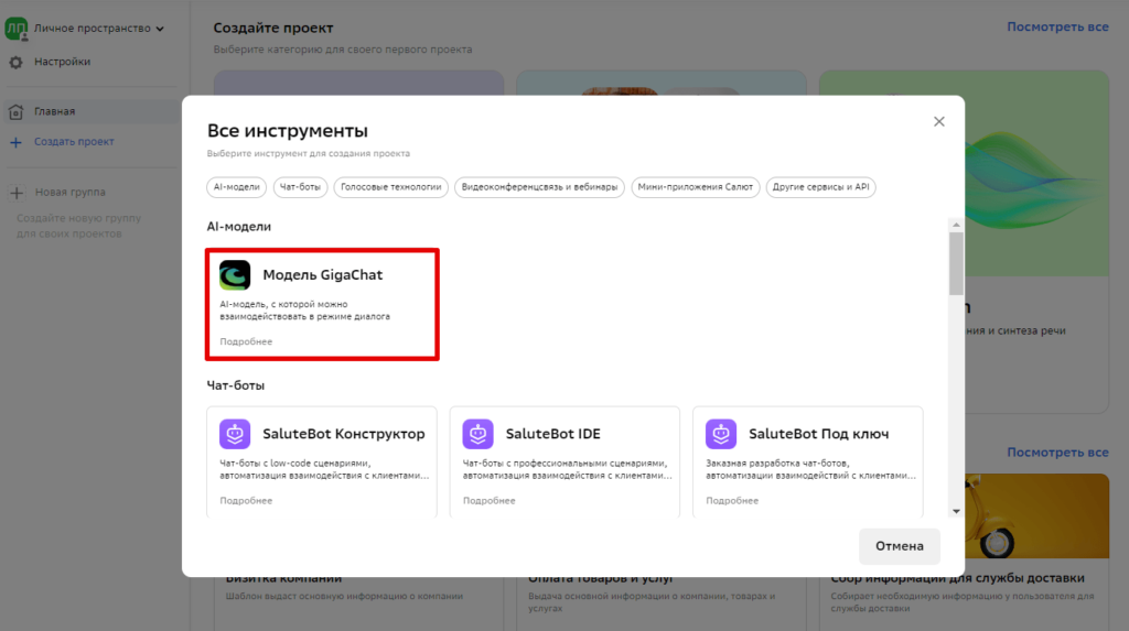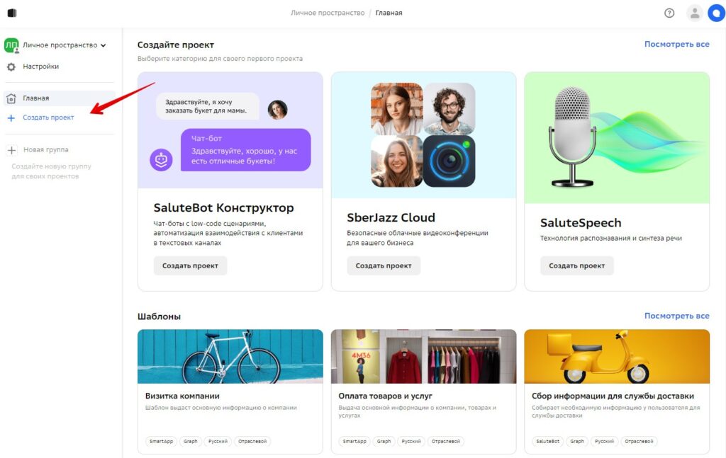 Как мы уже сказали, скачать GigaChat нельзя — пользоваться нейросетью можно только в браузере через личное пространство на Developers.sber. Для этого авторизуйтесь и нажмите кнопку «Создать проект».