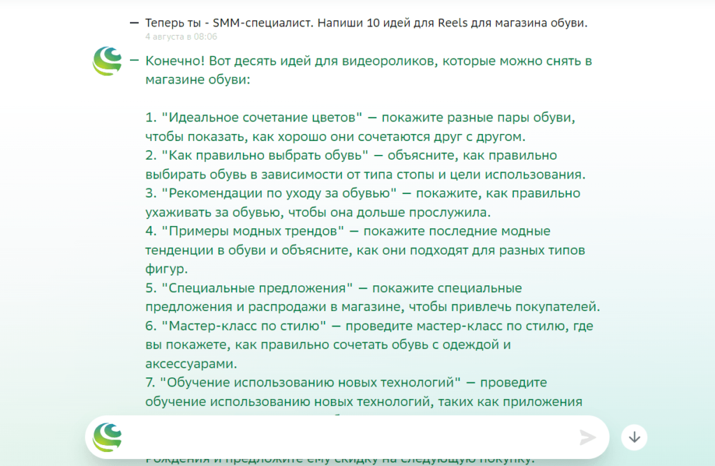 ✔ Придумать идеи для контент-плана. Это точно облегчит работу SMM-специалистов — искать идеи так гораздо проще. GigaChat умеет составлять контент-планы, предлагает сценарии Reels и пишет посты.