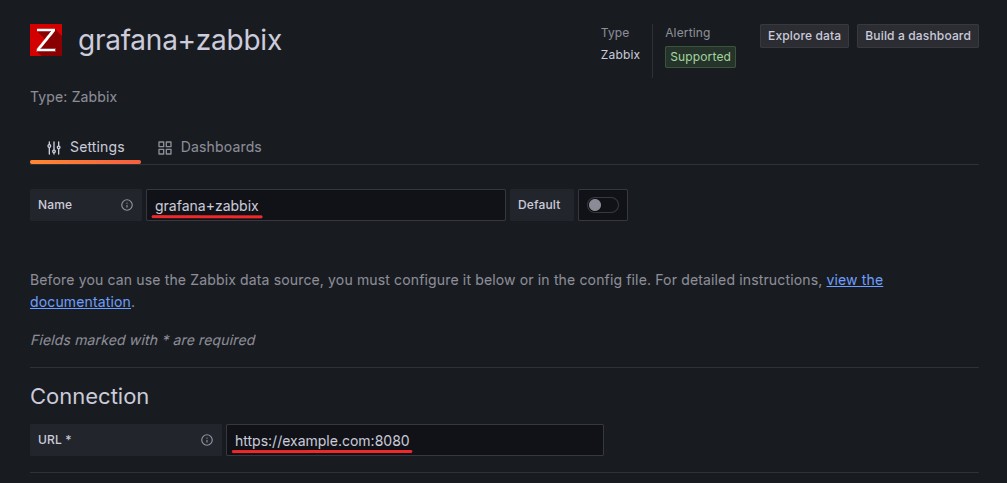 - Укажите произвольное название на латинице для источника данных. Затем введите домен или IP-адрес сервера, на который установлен Zabbix, с указанием порта: