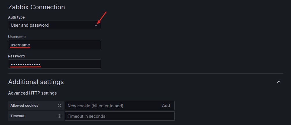 - Выберите способ идентификации пользователя. Затем введите логин и пароль пользователя Zabbix: