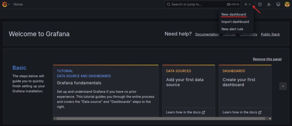 - Разверните меню со знаком «плюс». Затем выберите вариант New dashboard: