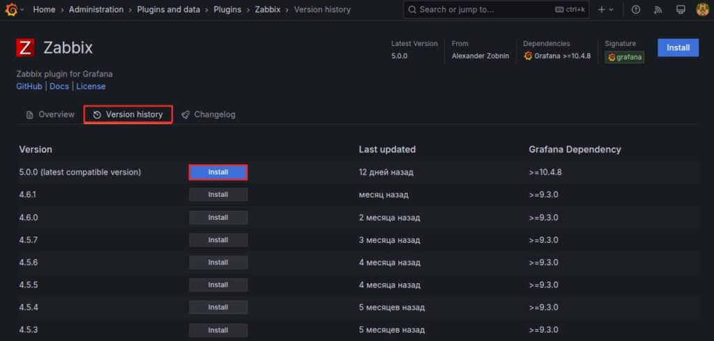 - Перейдите на вкладку Version history. Выберите нужную версию плагина и справа от номера версии нажмите Install: