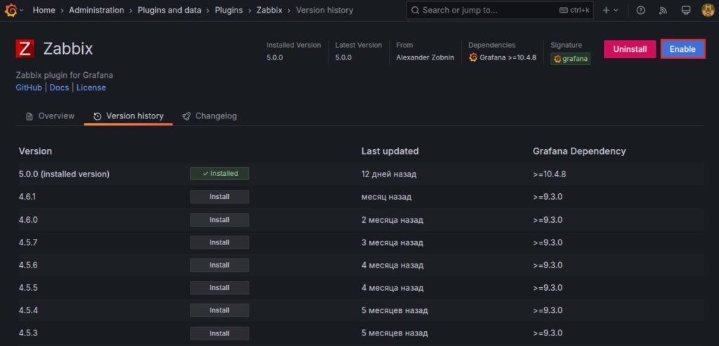 - По окончании установки включите плагин Zabbix, нажав Enable: