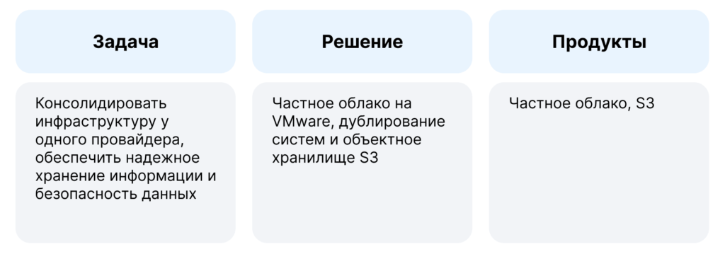 Предоставили отказоустойчивое частное облако с собственным парком серверов, которое обеспечивает быстрое наращивание ресурсов под ИТ-разработку, контроль затрат и надежность хранения данных. В качестве основы выбрана платформа на VMware, на нее последовательно смигрированы из других публичных облаков среды разработки, бизнес-приложения и корпоративные сервисы клиента. Для этого проекта компания впервые запустила объектное хранилище S3 в частном облаке.
