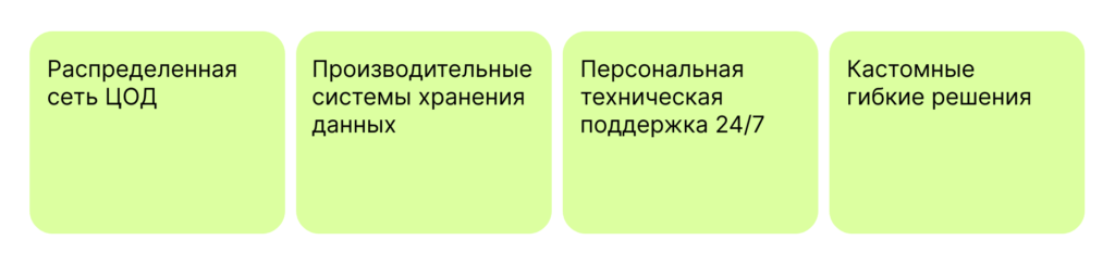 - Распределенная сеть ЦОД — серверы компании расположены в дата-центрах уровня Tier III, за счет дублирования всех систем и двойному резервированию аптайм составляет 99,98%.