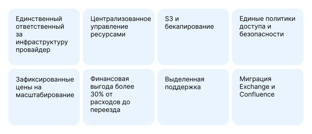 - Финансовая выгода более 30% от расходов до переезда. Снижение затрат связано как с оптимизацией ресурсов, так и с уменьшением расходов на поддержку и обслуживание. Эти средства можно реинвестировать в развитие новых продуктов.