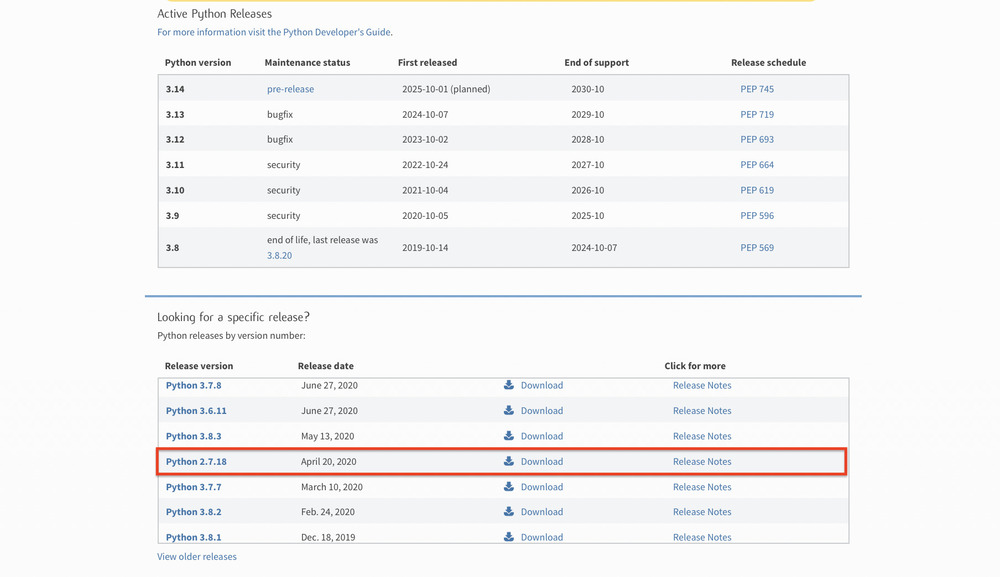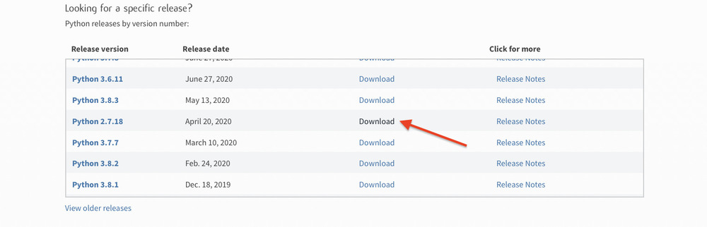 Перед вами откроется список доступных версий. Чтобы найти Python 2, обратите внимание на подраздел Look for a specific release.