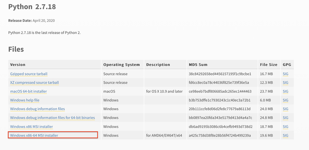 - Найдите установщик, который соответствует вашей системе. Для 64-битной версии Windows потребуется файл с названием Windows x86-64 MSI installer.