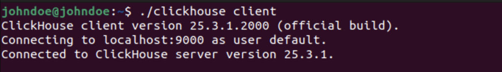 После успешного подключения в терминале появится информация о версии ClickHouse и состоянии соединения: